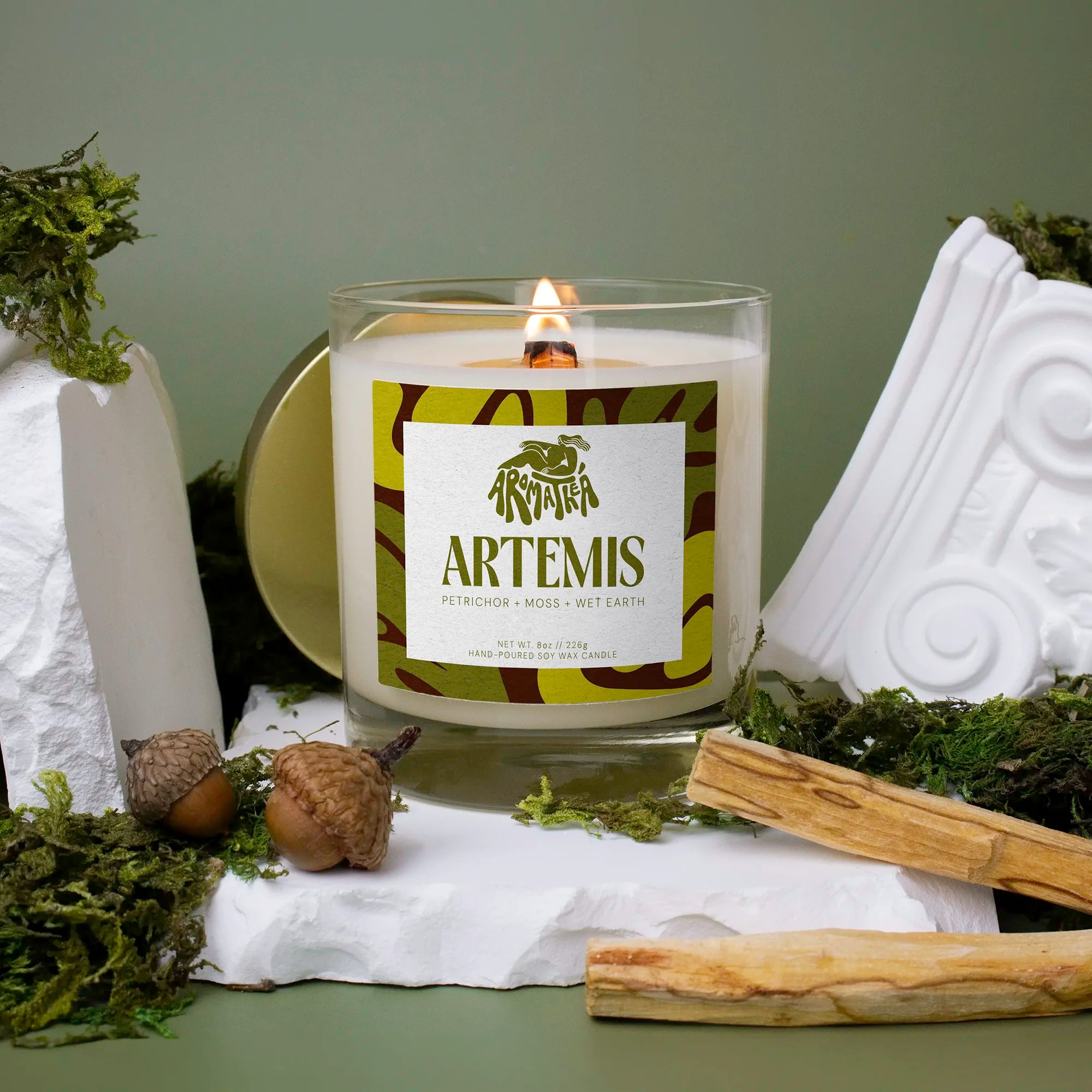 This petrichor candle will please even the pickiest of pluviophiles. Immerse yourself in the primal, earthy fragrance of our Artemis Candle and invoke the goddess of the untamed wilds. Inspired by the formidable goddess of the hunt, our Artemis Candle is a grounding scent that brings the essence of rain-soaked woods into your home. Top notes of sage and ozone float like mist through the forest canopy, blending flawlessly with mid notes of lavender and moss, grounded by the base of wet earth covering the forest floor. Light our Artemis candle and escape to the wilds with your new favorite scent!